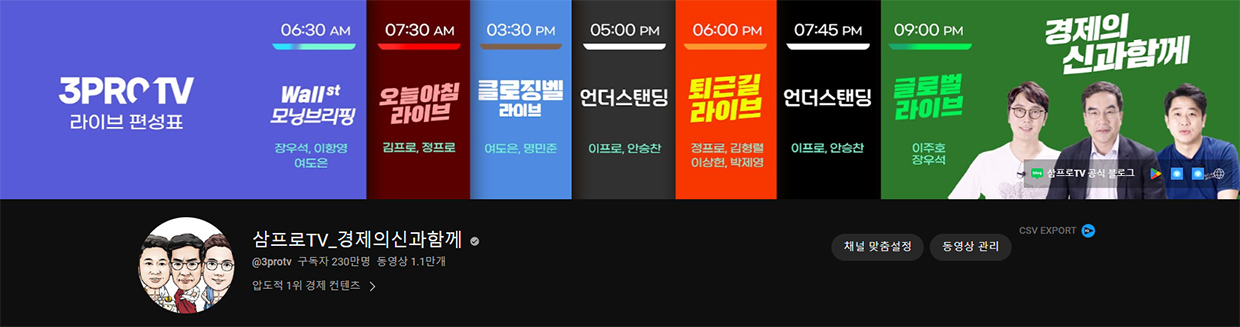 삼프로TV는 2018년 1월 17일 팟캐스트 업로드를 시작으로, 2019년 1월 24일 아침, 첫 라이브 방송을 통해 유튜브에서 팬분들을 만났습니다.